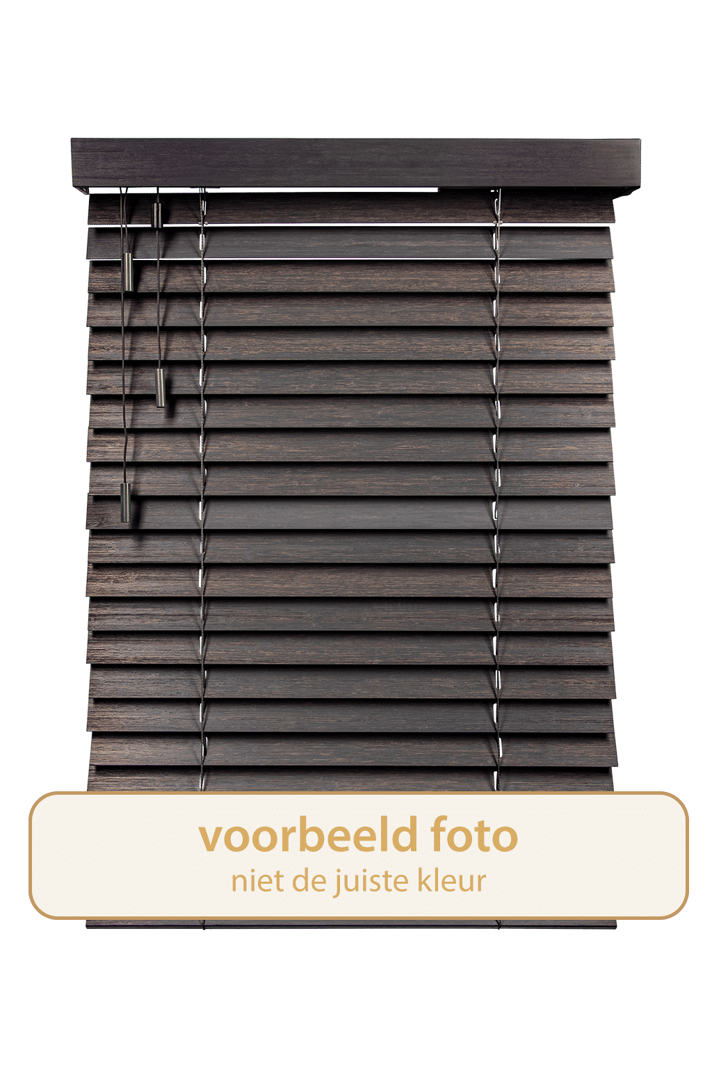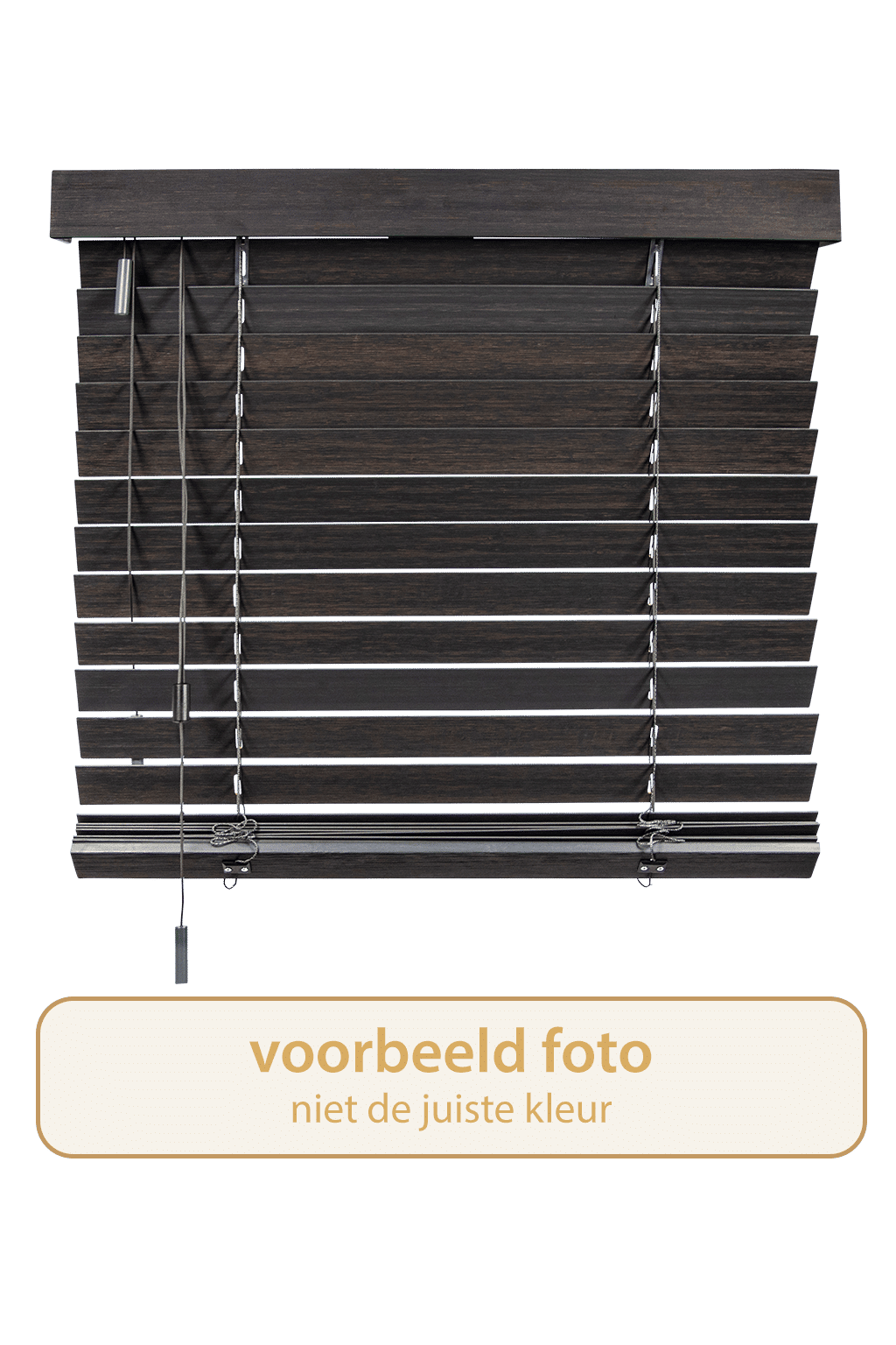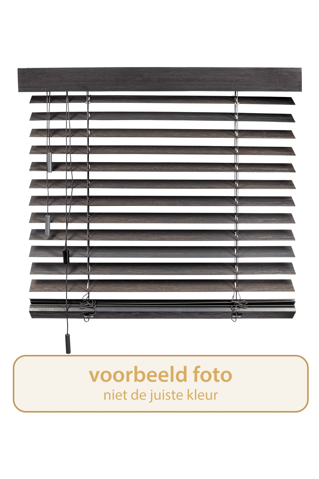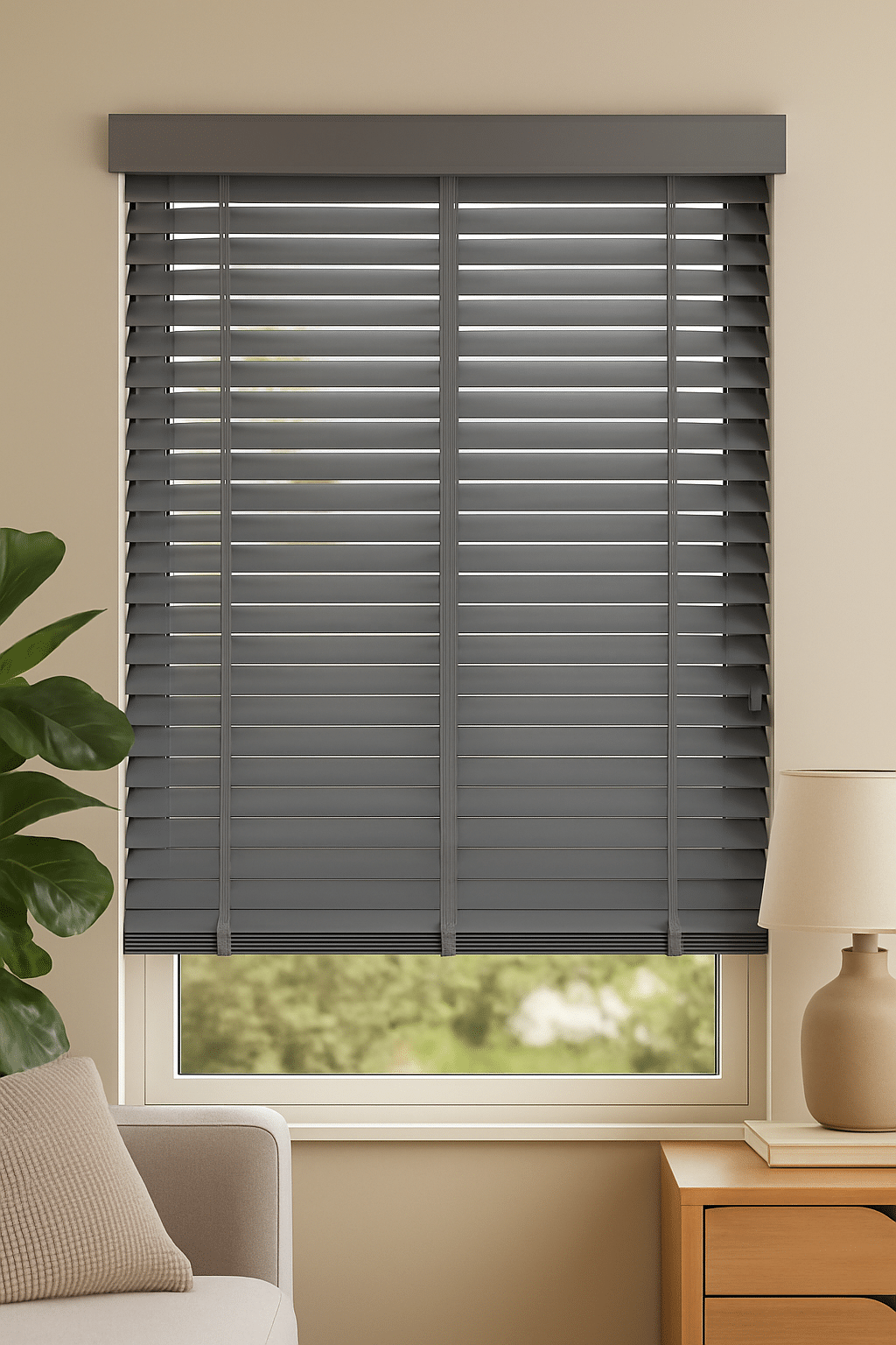 Een grijze houten jaloezie geeft elke ruimte een luxe, moderne uitstraling met optimale lichtcontrole en tijdloze warmte.